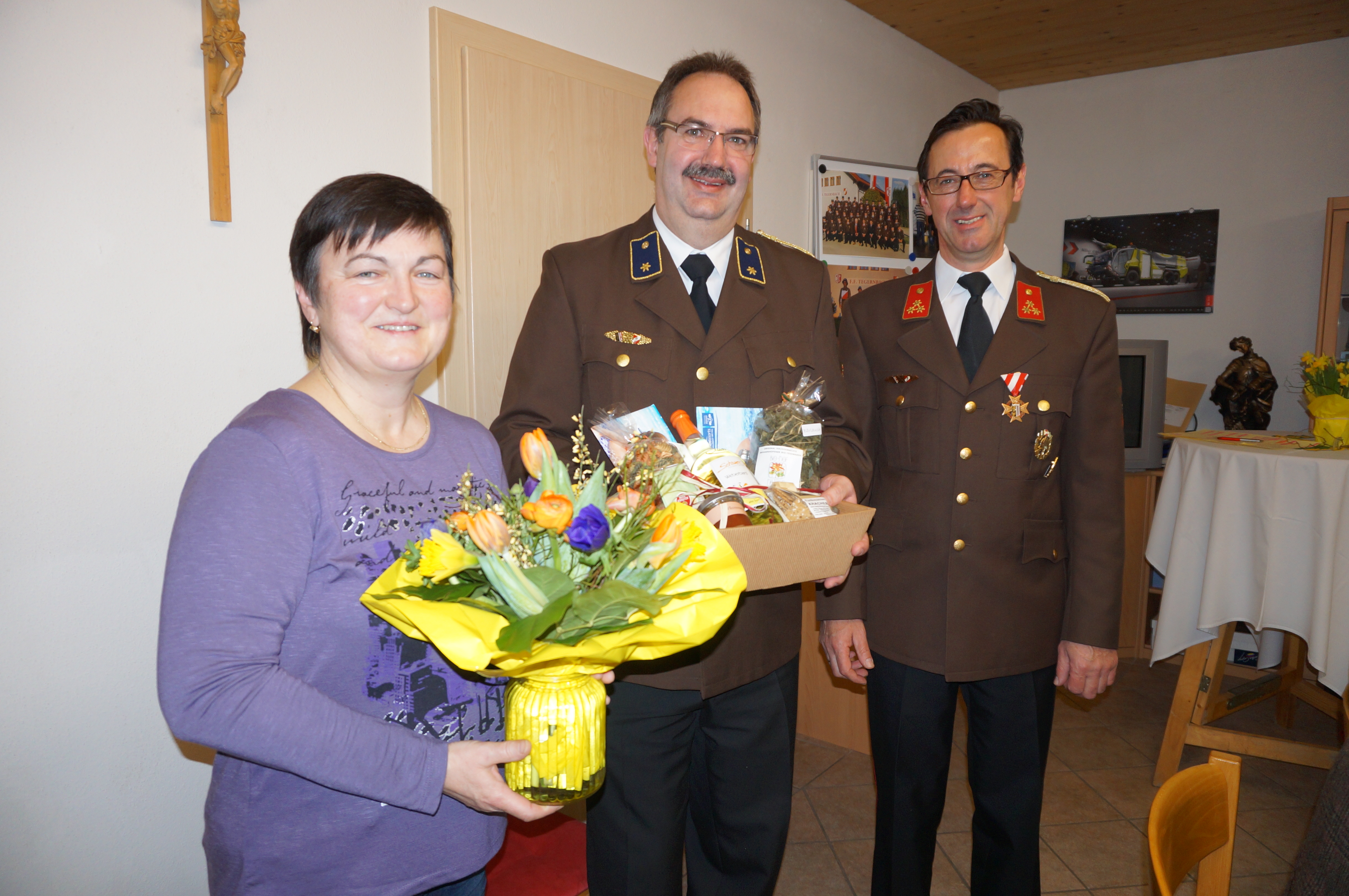 Abschließend bedankte sich Kommandant Erwin Auinger bei Norbert Dopplmair für die jahrelang vorbildliche Tätigkeit als Schriftführer. Norbert war neben seiner Tätigkeit in der Feuerwehr auch Jahrzehnte lang im Abschnitts- und Bezirksfeuerwehrkommando tätig. Im Namen der Feuerwehr Tegernbach überreichte Erwin Auinger als Dank an Norbert und seiner Gattin Annemarie einen Thermengutschein mit Geschenkskorb.
