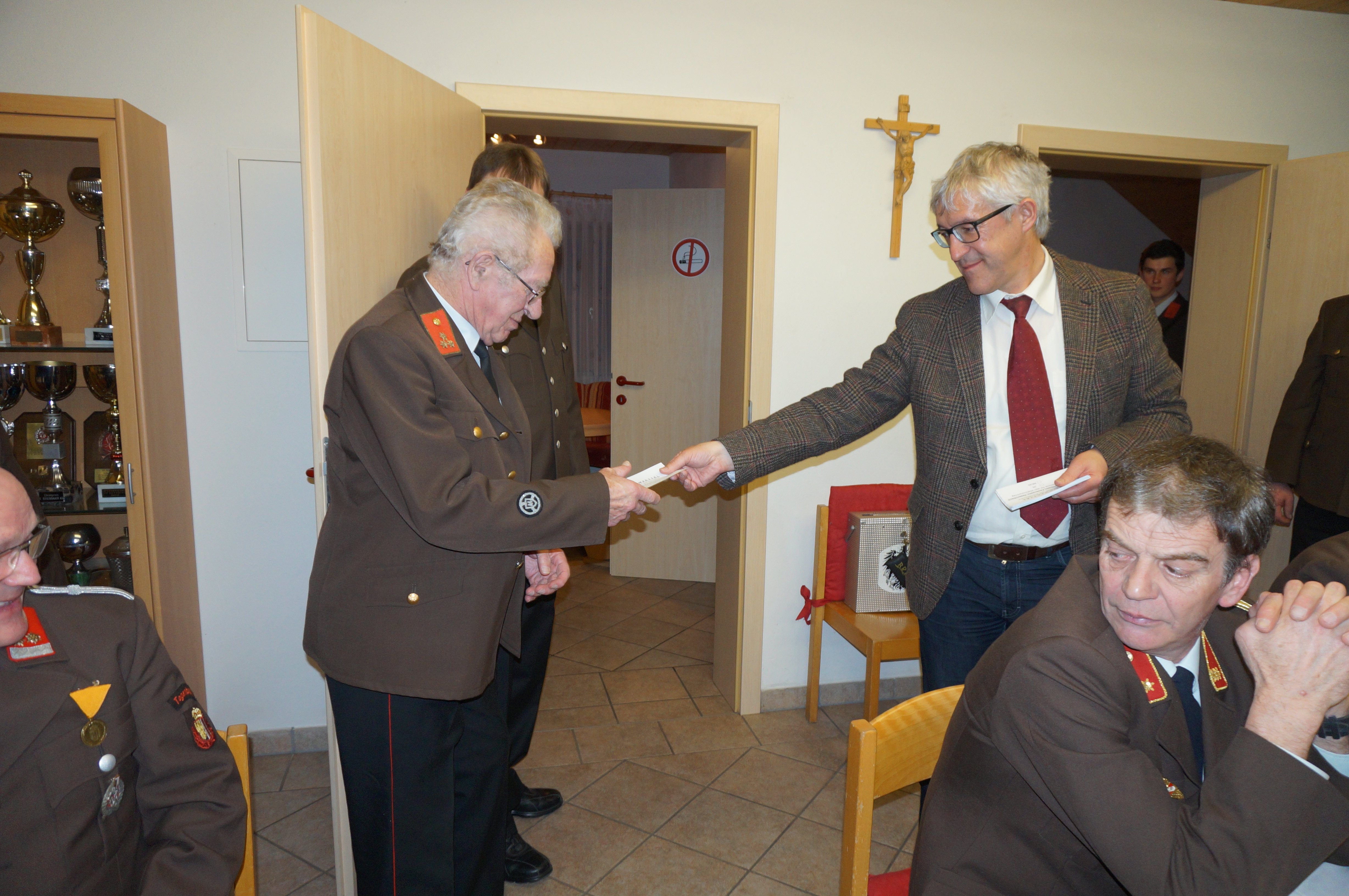 der ehemalige Schriftführer Norbert Dopplmair (li.) bei seiner Amtsübergabe an Michael Schneeberger (re.) mit Kommandant Erwin Auinger