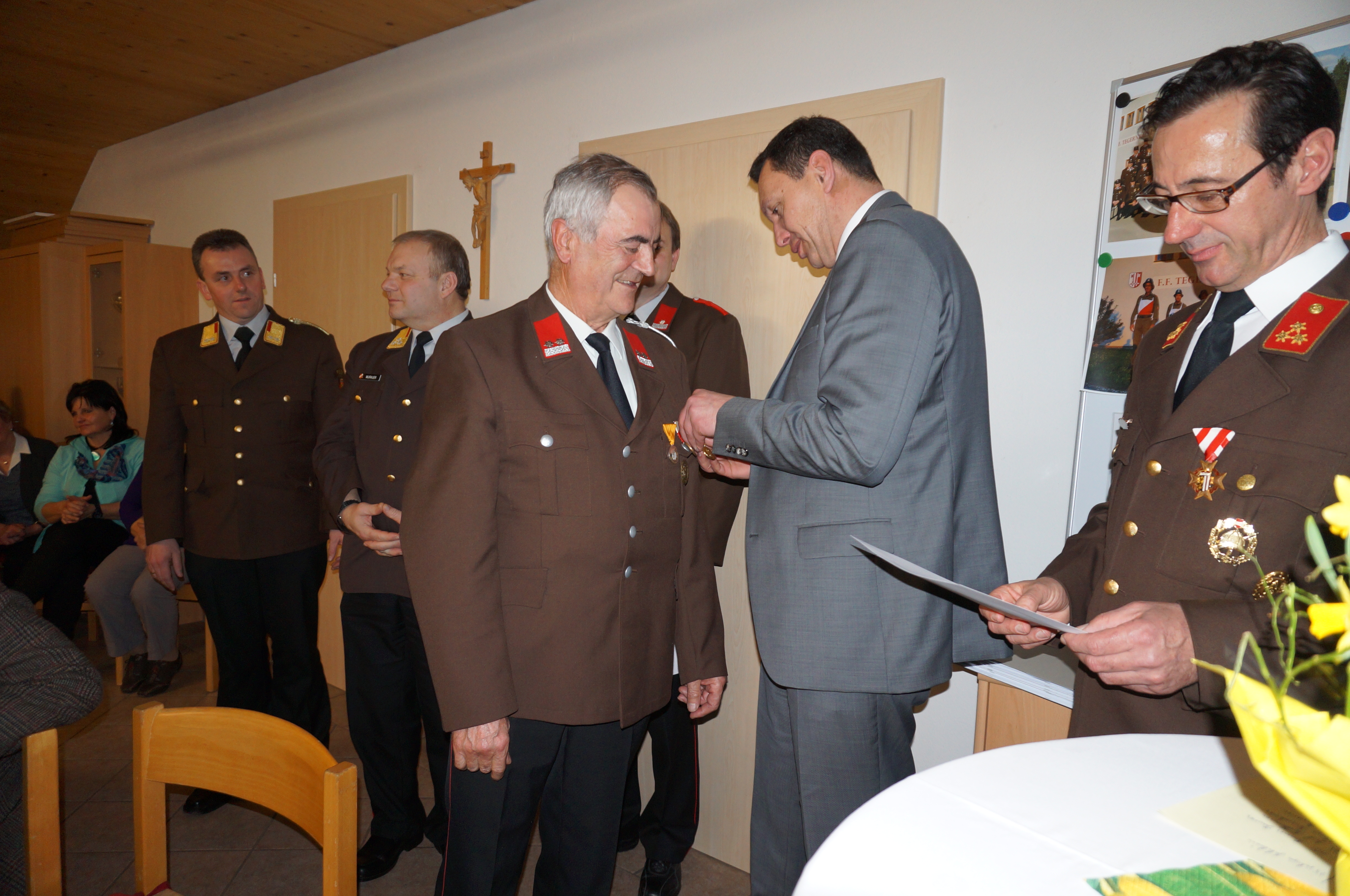 v.l.n.r: Bezirksfeuerwehrkommandant Josef Murauer, Abschnittsfeuerwehrkommandant Johann Kronsteiner, Franz Blätterbinder (für 25 Jahre Feuerwehrdienst geehrt), Karl Edlbauer (für 50 Jahre Feuerwehrdienst geehrt), Bürgermeister Klaus Höllerl und Kommandant Erwin Auinger