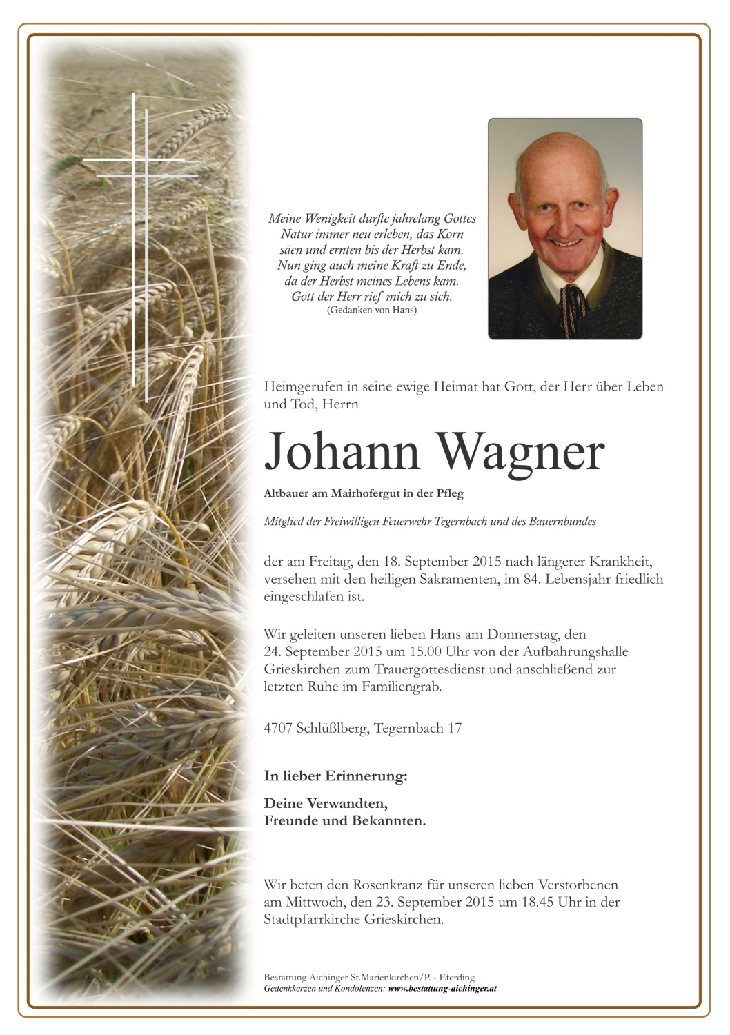 Mit tiefer Betroffenheit müssen wir bekannt geben, dass unser langjähriger Kamerad Johann Wagner, vlgo. Mairhofer in der Pfleg am Freitag, 18.09.2015 im 84. Lebensjahr nach schwerer Krankheit verstorben ist.