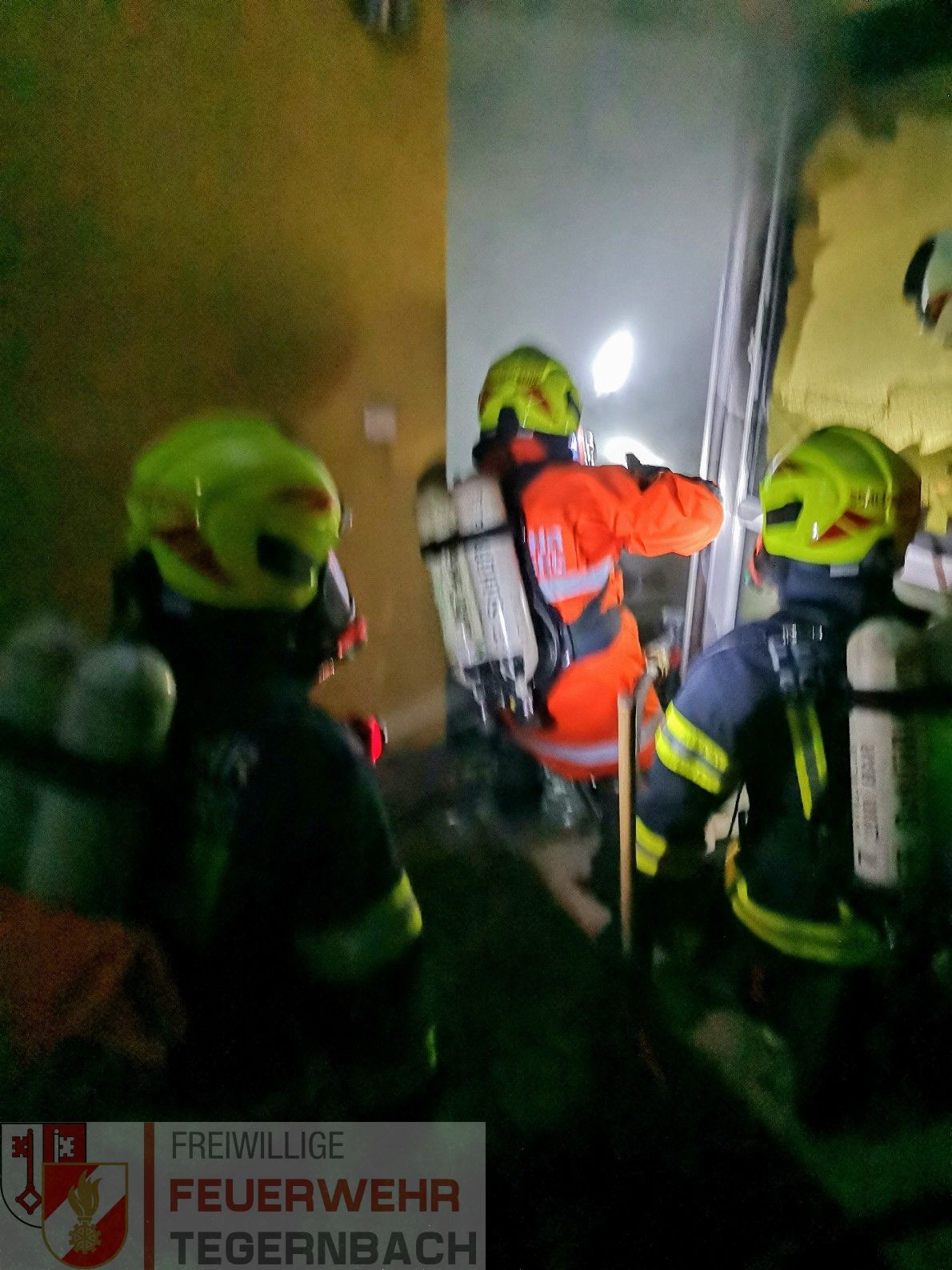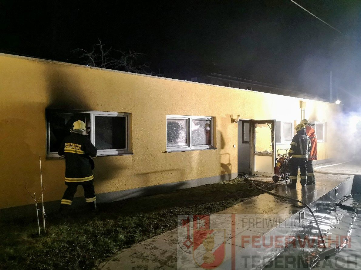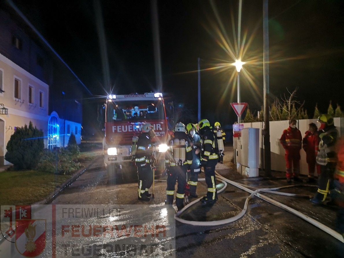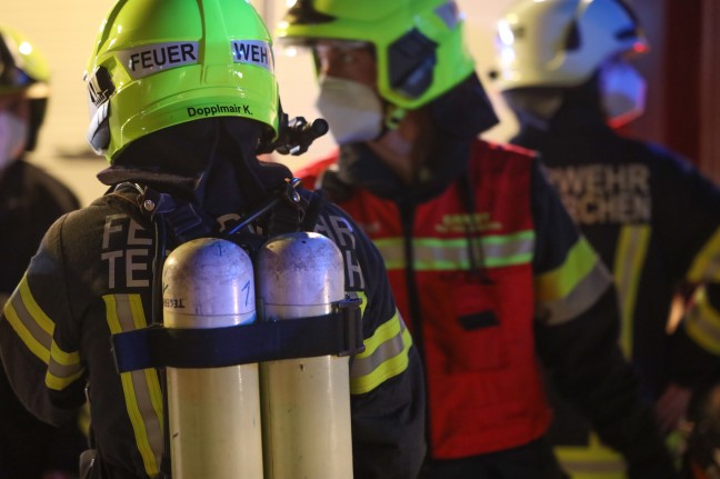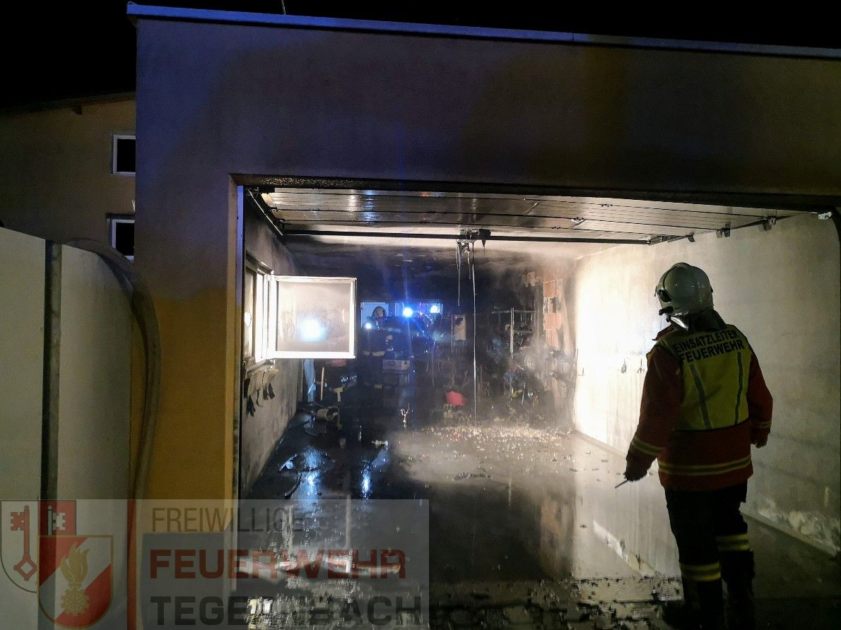 Eine starke Rauchentwicklung zeigte sich beim Eintreffen der Feuerwehren im Bereich der größeren Garage und im angebauten Wohnhaus. Nachdem sich im Gebäude keine Personen mehr befanden, konnte nach dem Einschlagen einer Zugangstüre der Garage unverzüglich mit der Brandbekämpfung begonnen werden. Ein Atemschutztrupp konnte mit Hilfe der Wärmebildkamera den Brand in der dicht verrauchten Garage lokalisieren und mit einem HD-Rohr ablöschen. Drei Atemschutztrupps führten neben der Brandbekämpfung auch die umfangreichen Belüftungsmaßnahmen durch, nachdem auch der gesamte Wohnbereich massiv verraucht war.