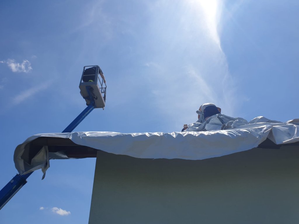 Mehrere durchlöcherte Hausdächer mussten in Tollet mit Hilfe eines Hubsteigers provisorisch mit Planen abgedeckt bzw. mit PU-Schaum abgedichtet werden.