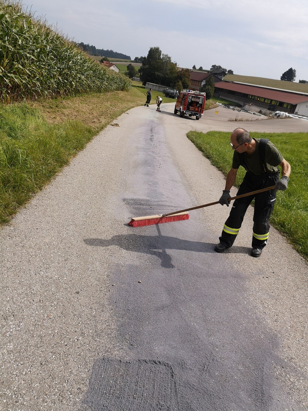 Durch die Einsatzkräfte der FF Tegernbach wurden mit knapp 10 Säcken Ölbindemittel die Ölspur gebunden und die Straße abgesichert.