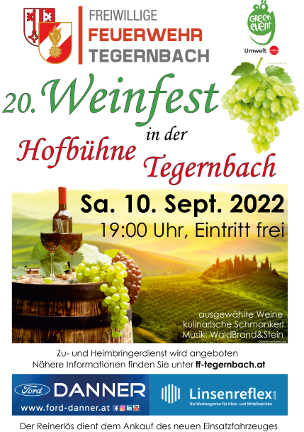 Am Samstag, 10.09. findet ab 19:00 Uhr das 20. Weinfest der Feuerwehr Tegernbach in der Hofbühne Tegernbach statt.