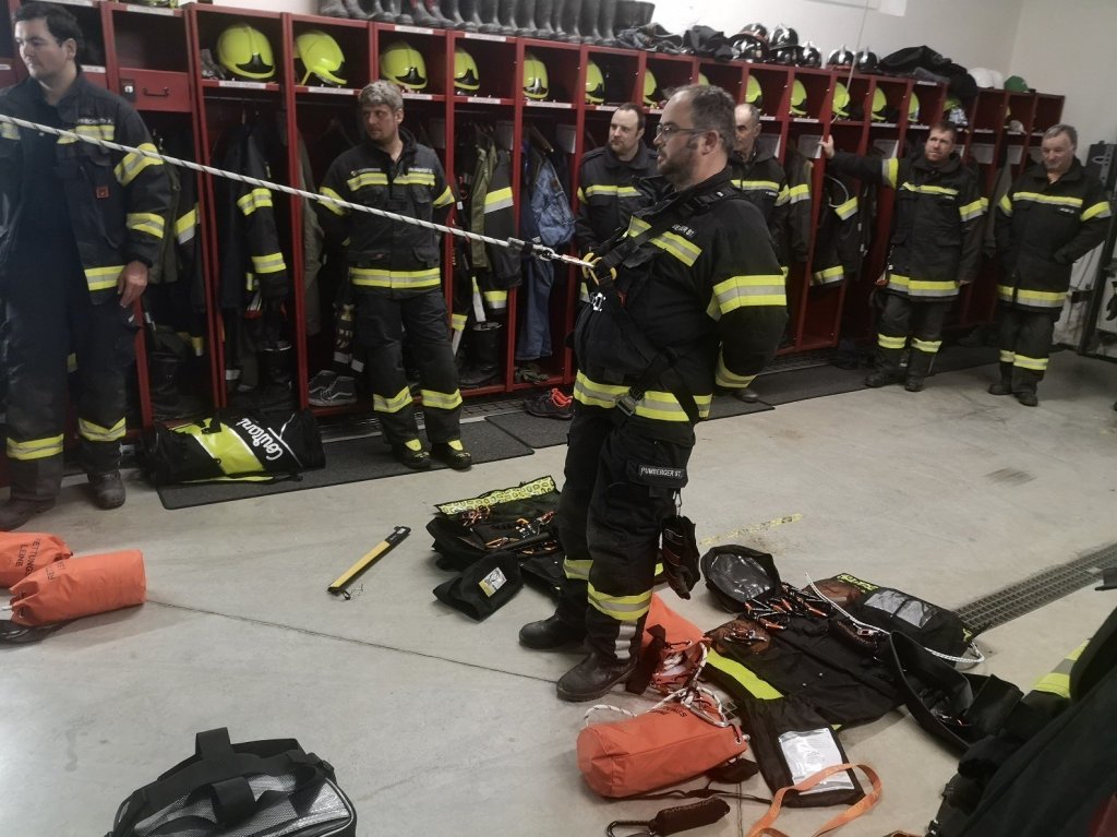 Unter der Leitung des Bezirks-Beauftragten der Höhenretter F. Breitwieser von der FF Gallspach wurden alle Ausrüstungskomponenten des neuen Absturzsicherungsset detailliert erklärt. Im Anschluss konnte in Kleingruppen die richtige Verwendung praktisch getestet werden.