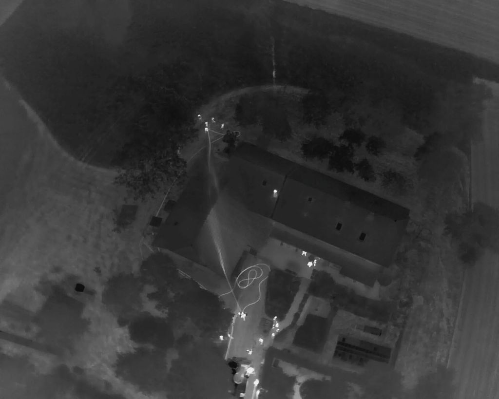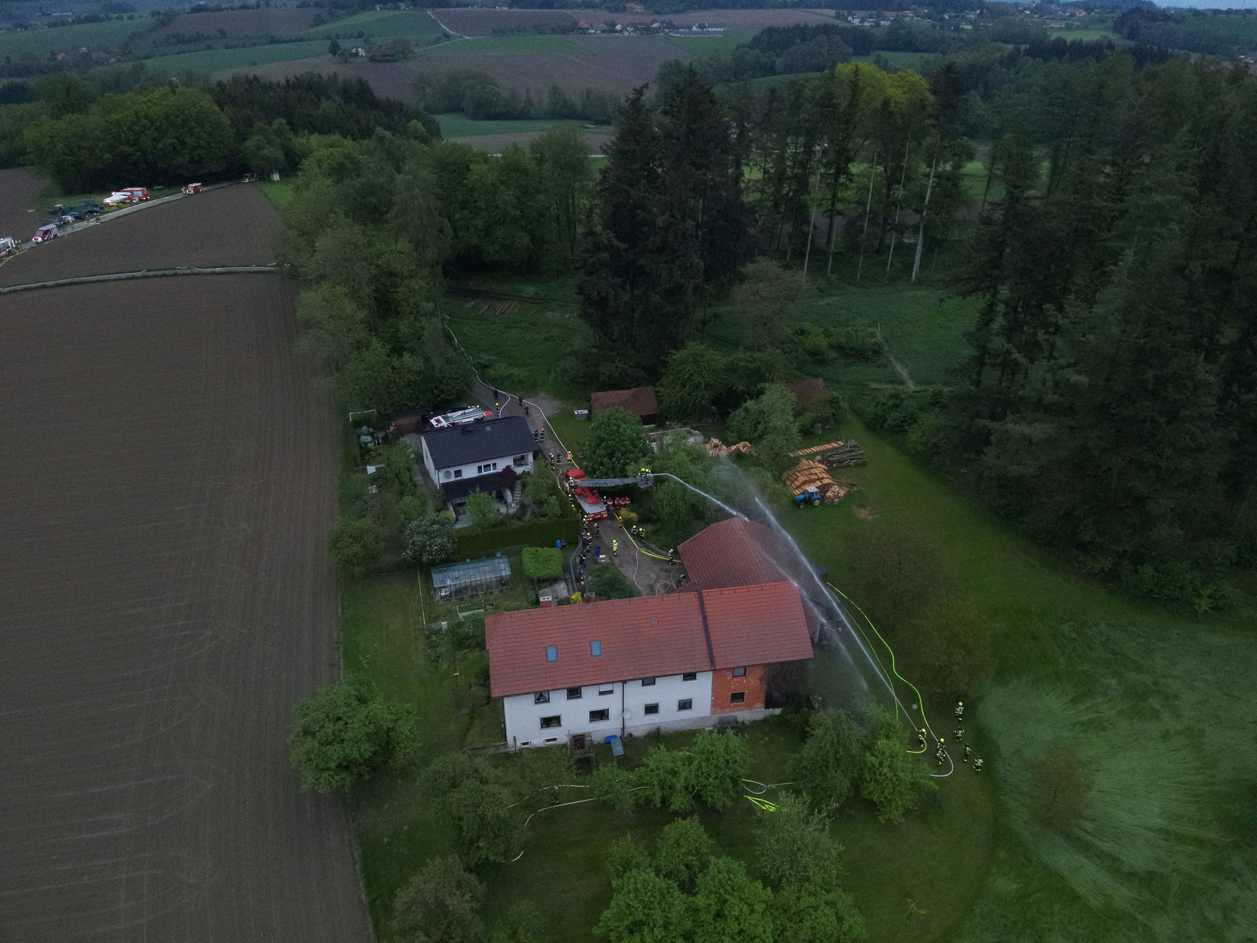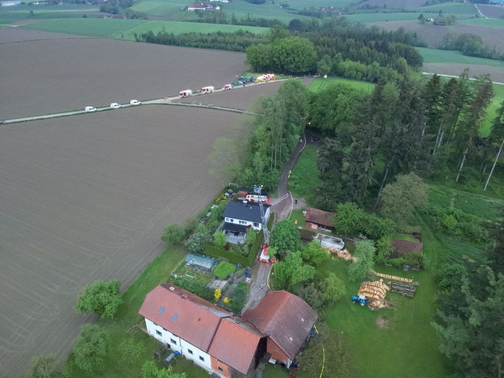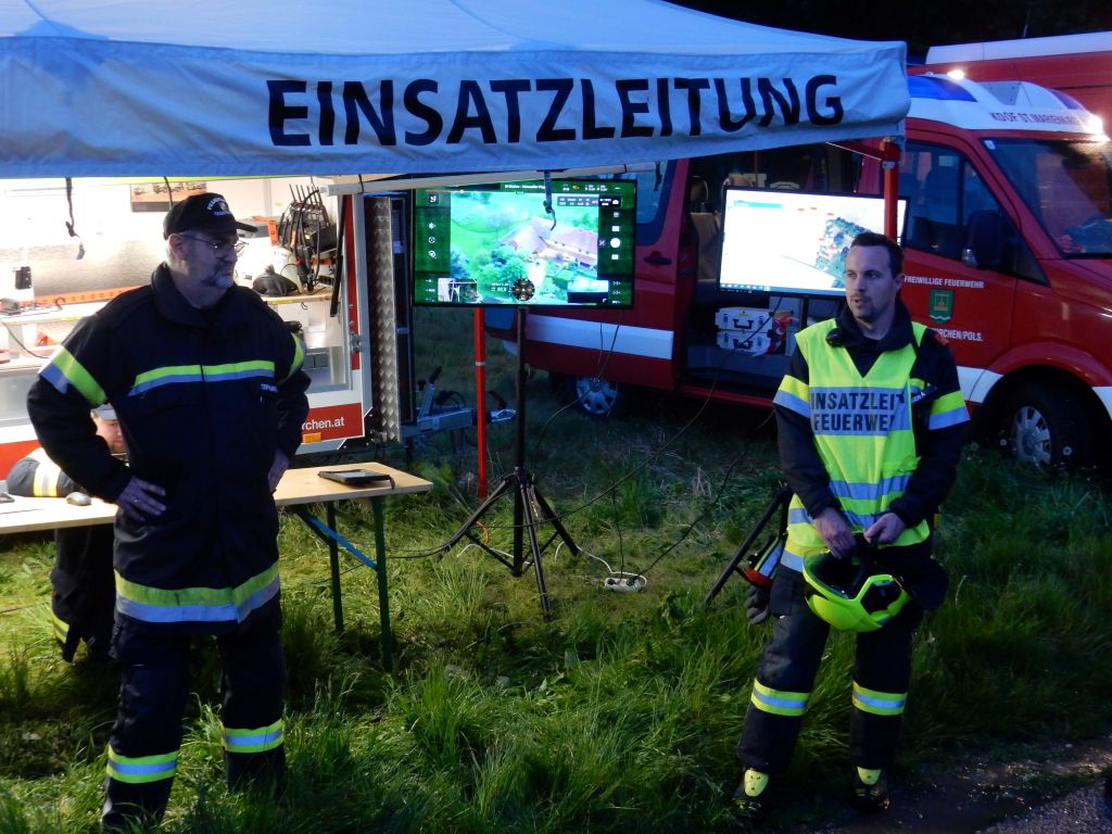 Inzwischen traf auch das Rote Kreuz mit drei SEW ein und übernahm die Betreuung der verletzten Personen. Die nachrückenden Feuerwehren unterstützten bei der Brandbekämpfung und errichteten zwei Zubringerleitungen vom 750 Meter entfernten Winshoferteich. Erstmals unterstützte die EFU-Einheit der FF St. Marienkirchen/P. die Einsatzleitung, auch eine Drohne wurde zur Lagebeurteilung aus der Höhe eingesetzt.