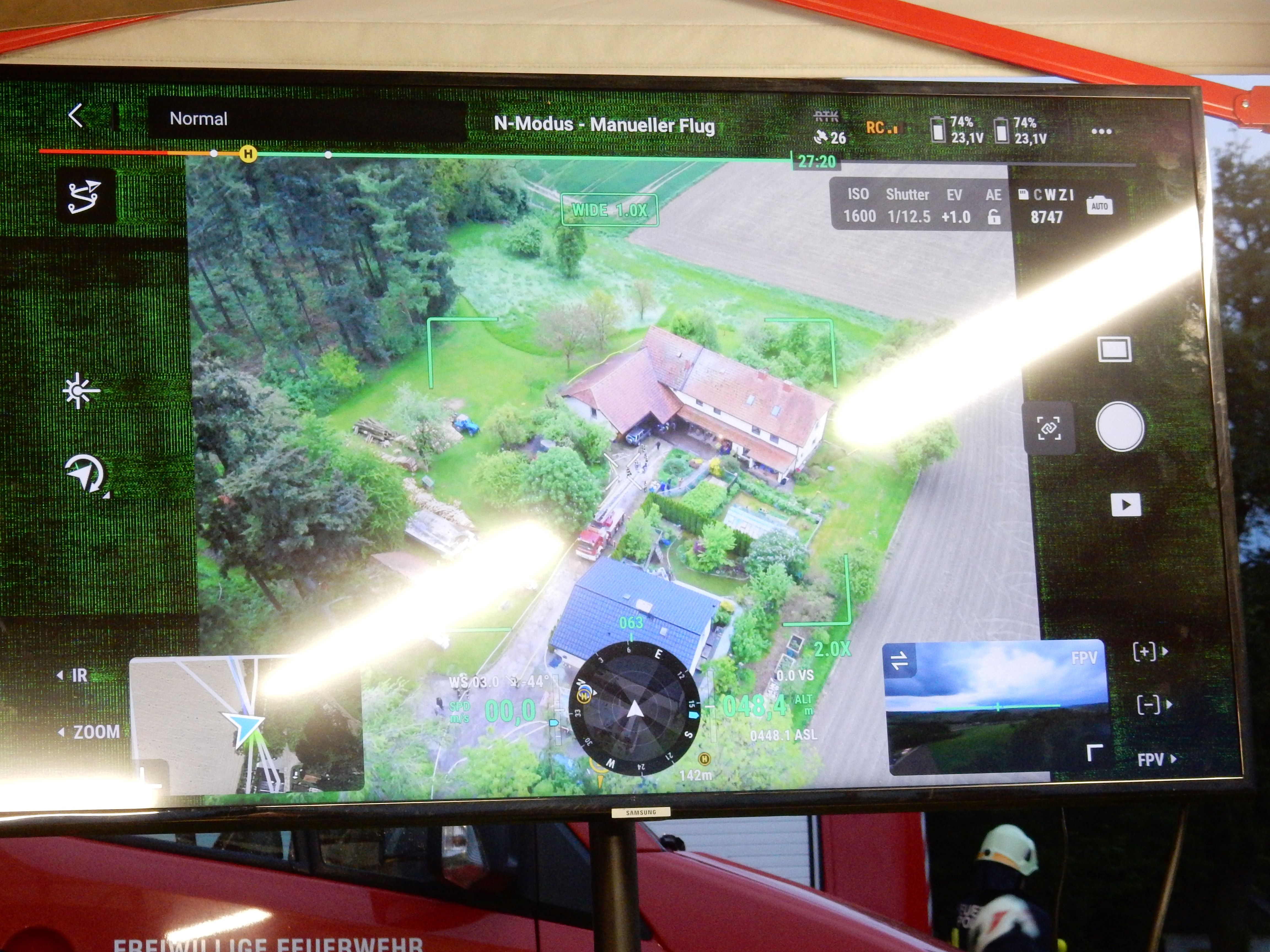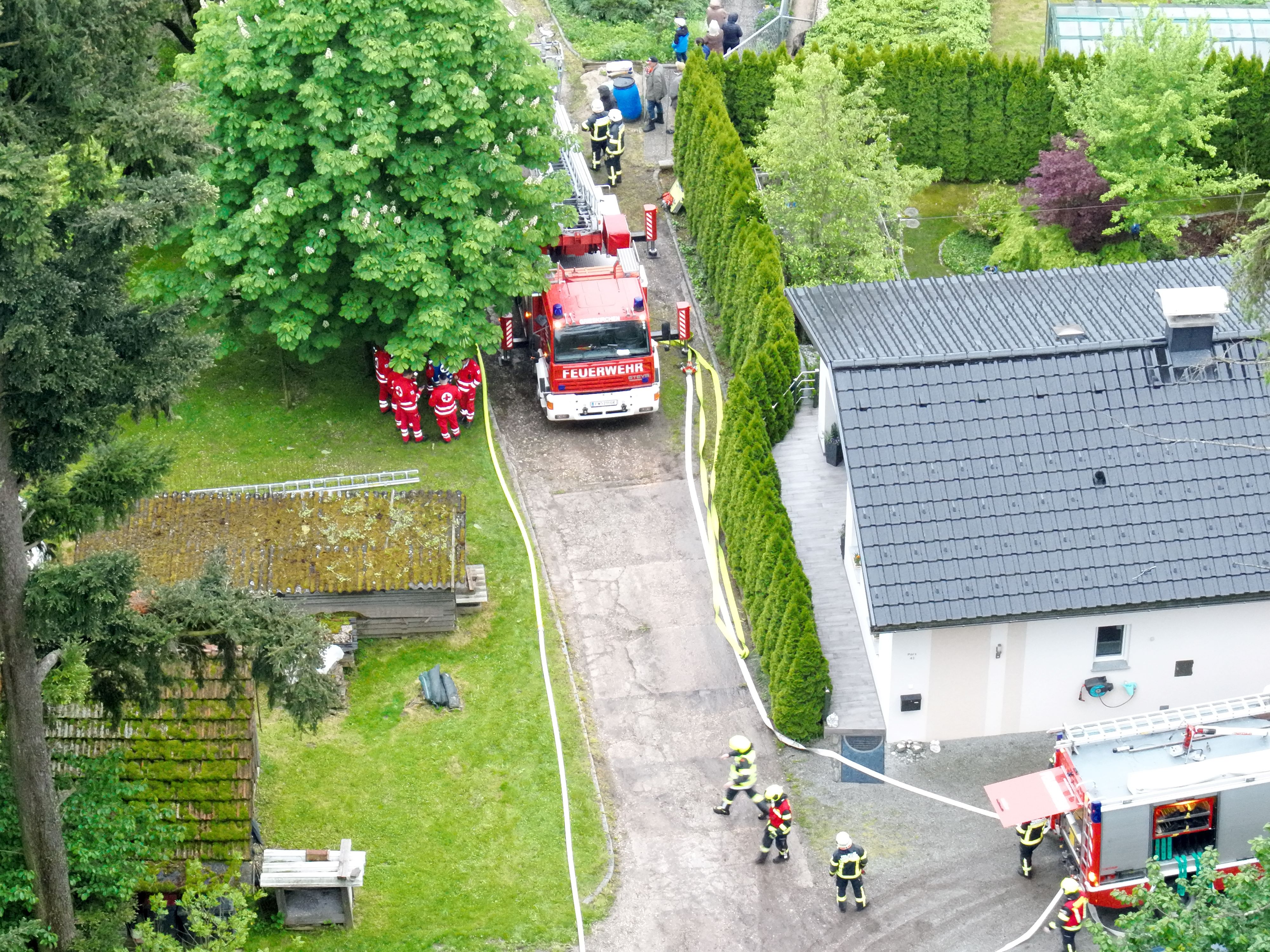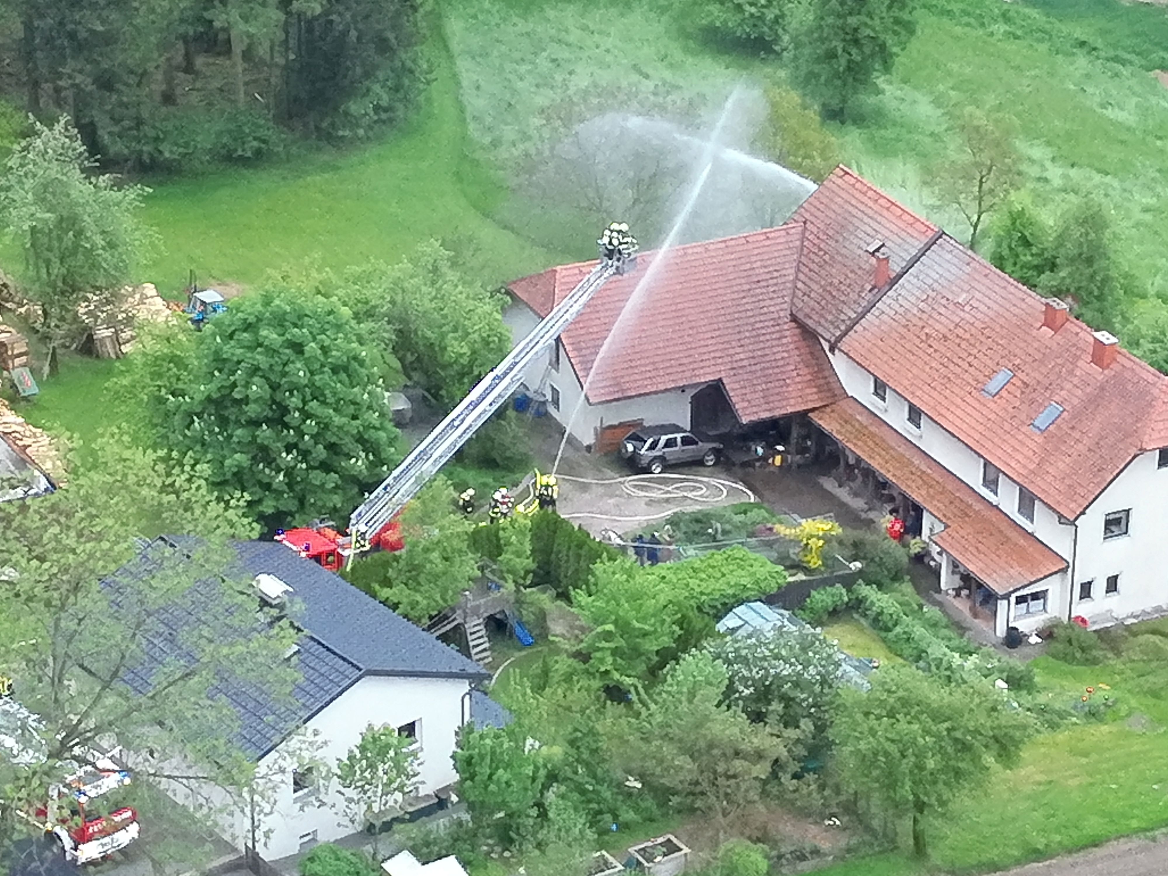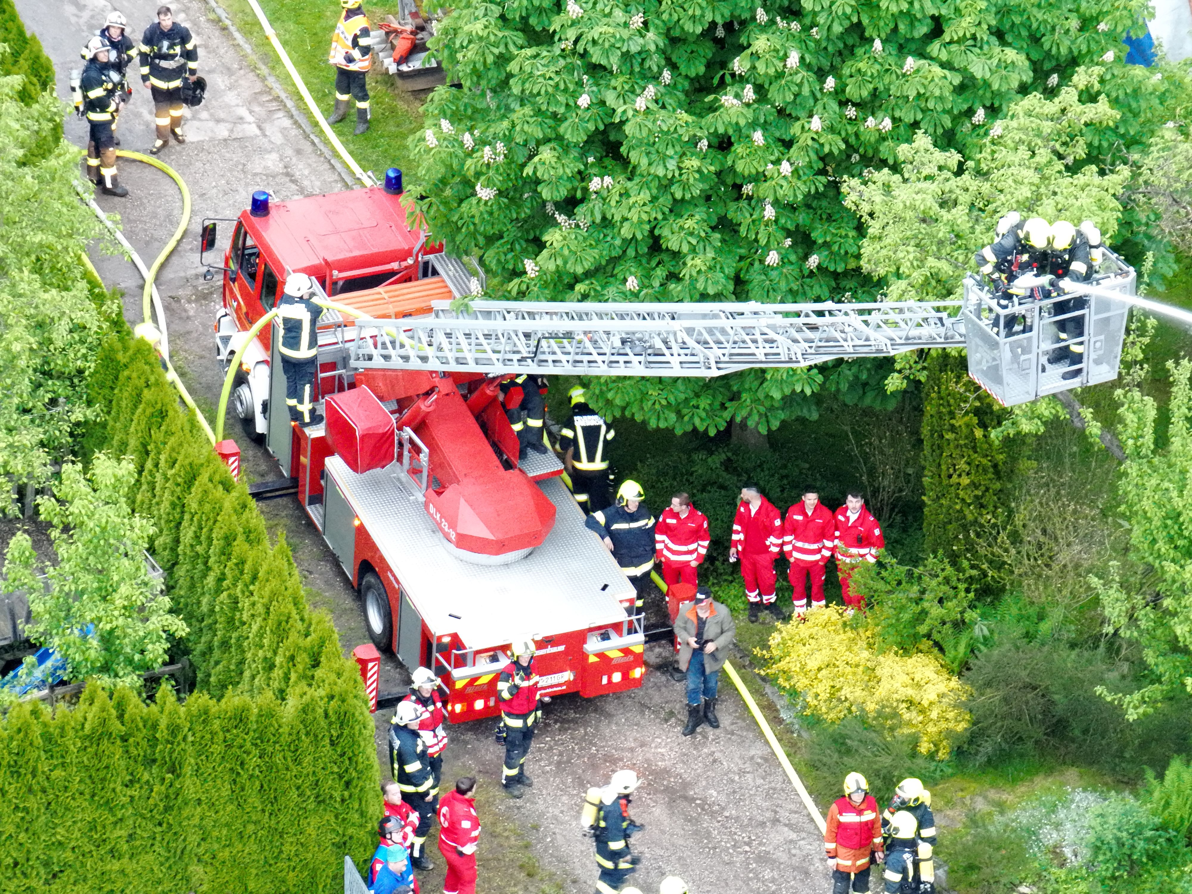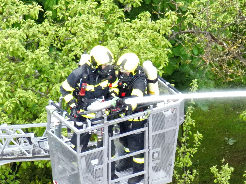 Erst nachdem die verletzte Person aus dem verunfallten Fahrzeug gerettet und der PKW geborgen werden konnte, war die Zufahrt zum Brandobjekt für die Drehleiter möglich. Diese übernahm im Anschluss auch mittels Wenderohr die Brandbekämpfung von oben.