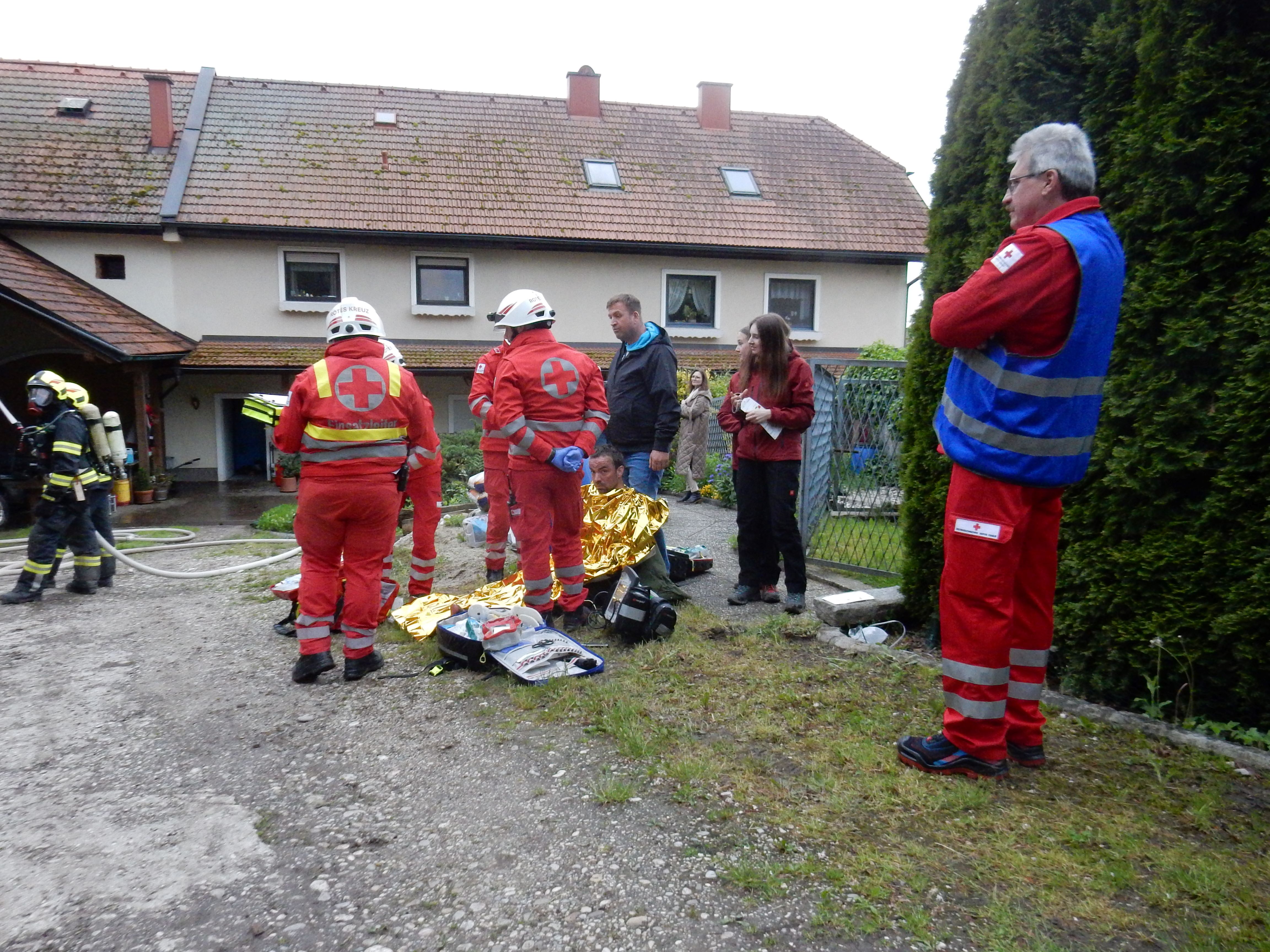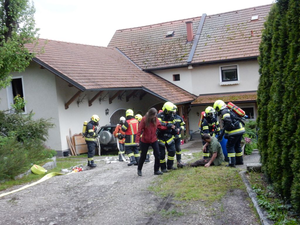 Aufgrund des Ausmaßes des Brandes, der bereits auf den Dachstuhl übergegriffen hatte, löste der Einsatzleiter HBI Auinger unverzüglich die Alarmstufe 2 aus. Während eine Mannschaft mit dem Verkehrsunfall beschäftigt war, begannen zwei Atemschutztrupps mit der Personenrettung und Brandbekämpfung beim Brandobjekt.
