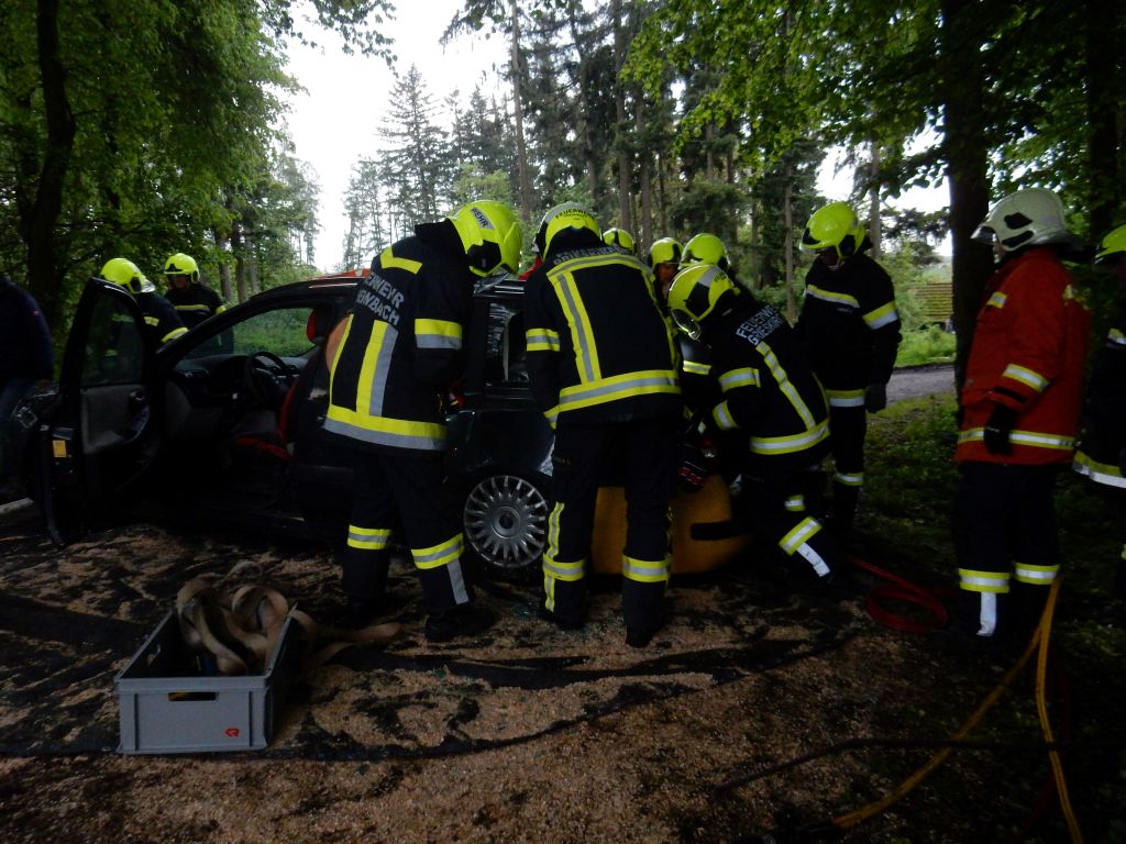 Eine Person war im Fahrzeug eingeklemmt, somit hatten die Einsatzkräfte zusätzlich zum Brandereignis den Verkehrsunfall abzuarbeiten.