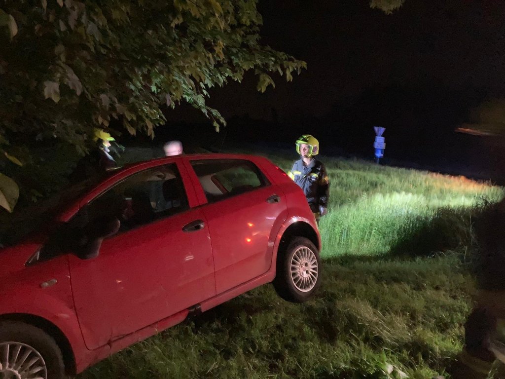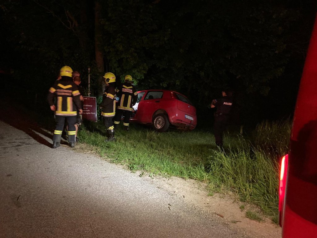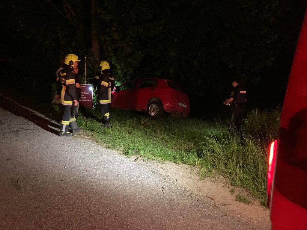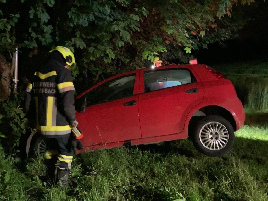 Ein PKW kam aus unbekannter Ursache von der Fahrbahn ab und krachte gegen einen Baum und ein Schild. Das Fahrzeug kam kurz vor dem Bachbett zum stehen und der Fahrer hatte großes Glück, er konnte unverletzt aus den Fahrzeug aussteigen.