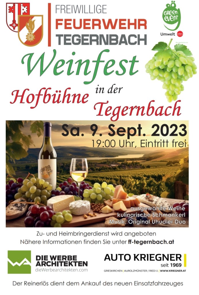 Die Freiwillige Feuerwehr Tegernbach ladet am Samstag, 09. September 2023 ab 19:00 Uhr zum traditionellen Weinfest in die Hofbühne Tegernbach ein.