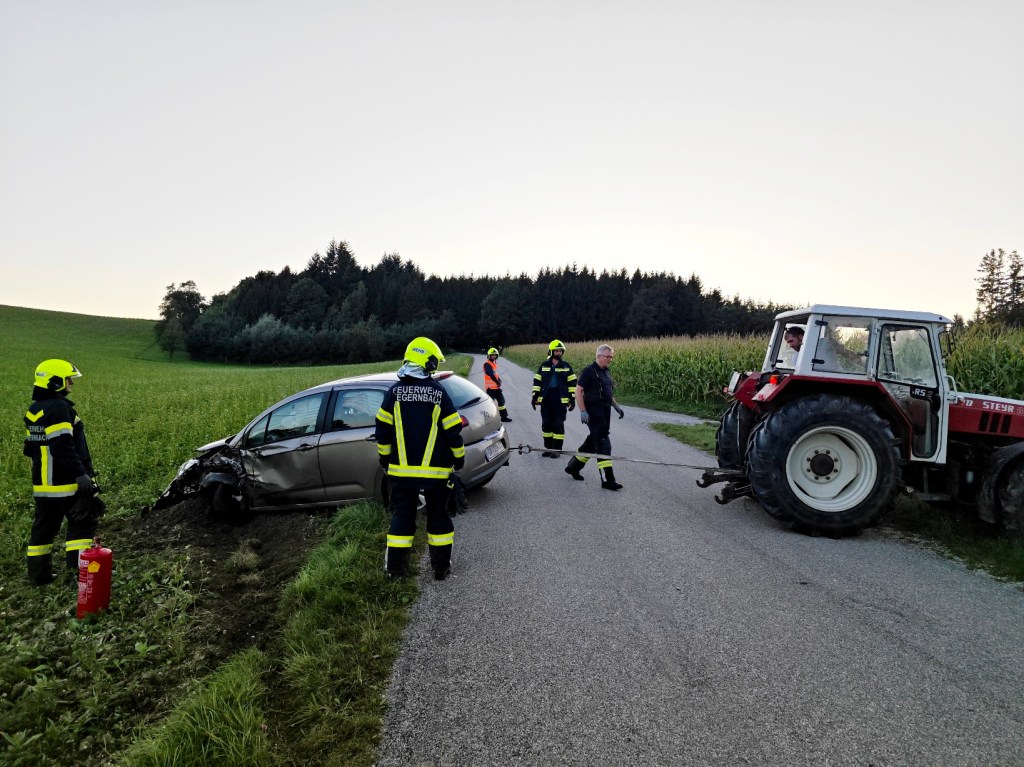 Ein PKW kollidierte mit einem entgegen kommenenden Traktorgespann. Das Auto wurde in ein Feld geschleudert, die Fahrerin und der Beifahrer konnten das Auto über die Beifahrertür glücklicherweise beinahe unverletzt verlassen.