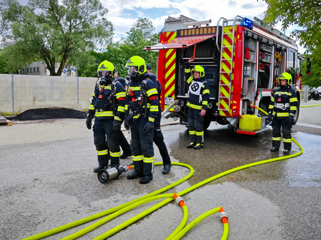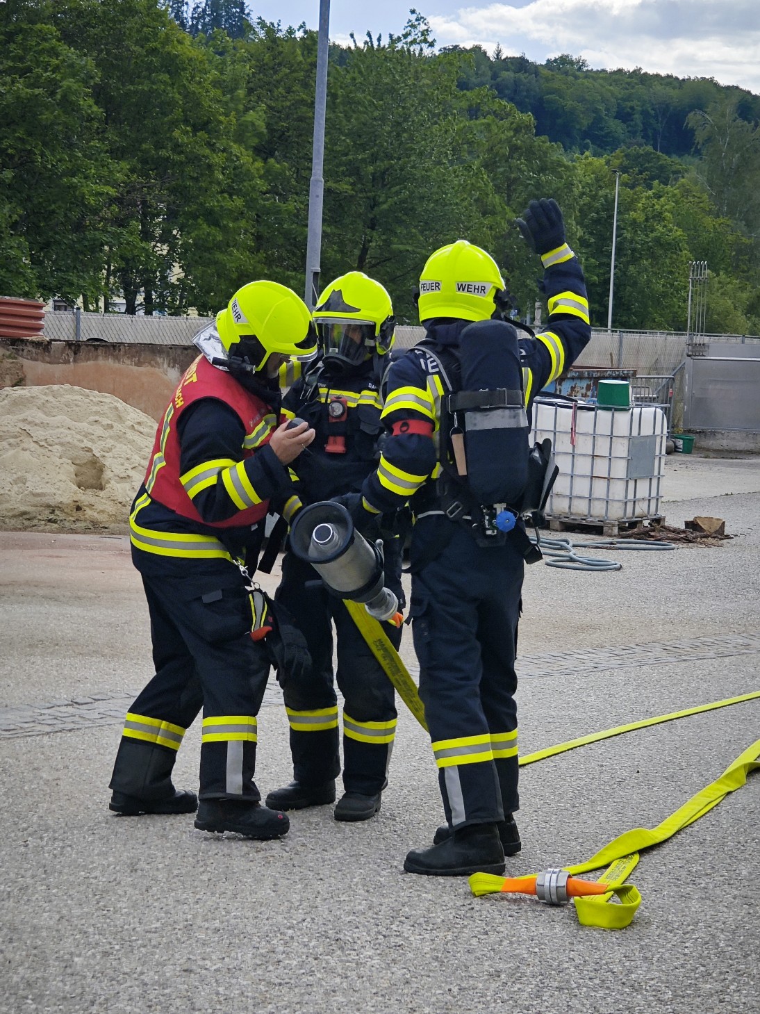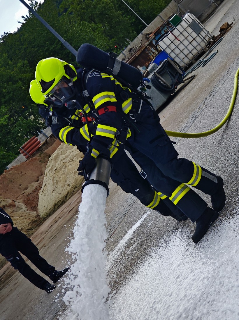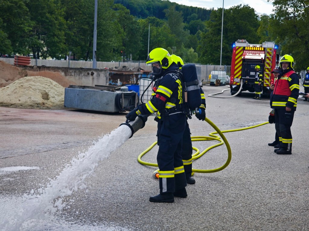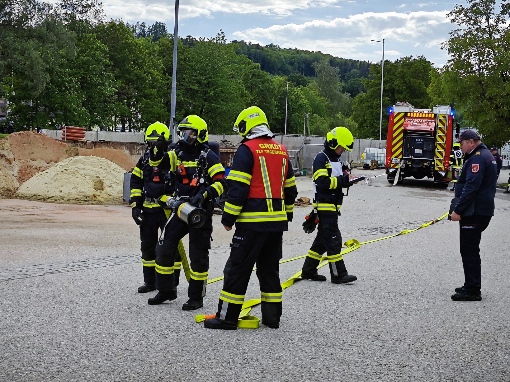 Nachdem die Gerätekunde positiv abgeschlossen wurde, erfolgte der Löschangriff in einer Sollzeit von 03:40 – 04:30 Minuten. Zwei Gruppen mussten einen Flüssigkeitsbrand mittels Mittelschaum unter Atemschutz und eine Gruppe einen Zimmerbrand bewältigen.