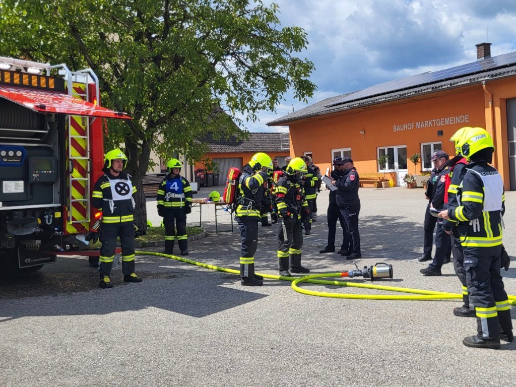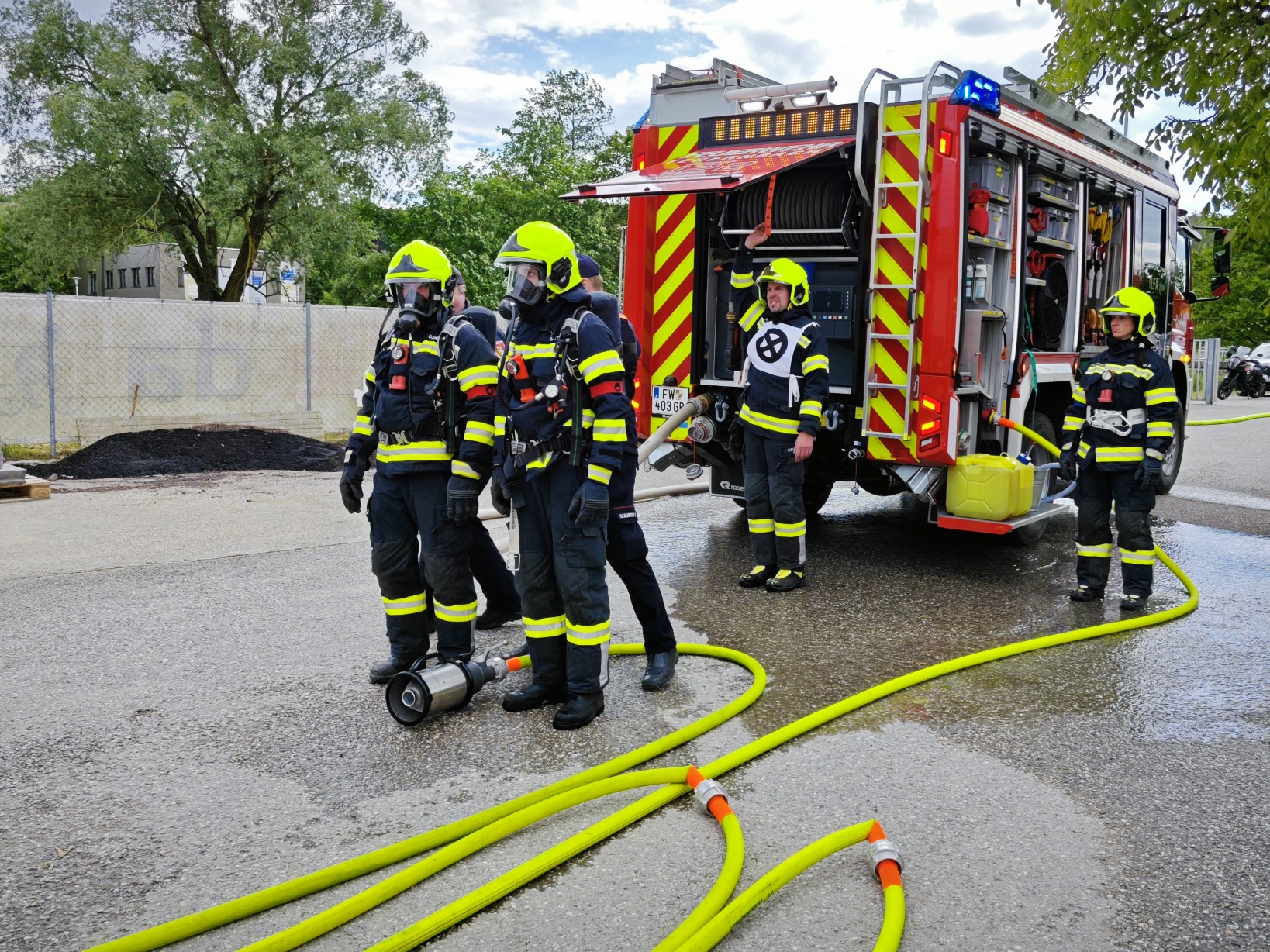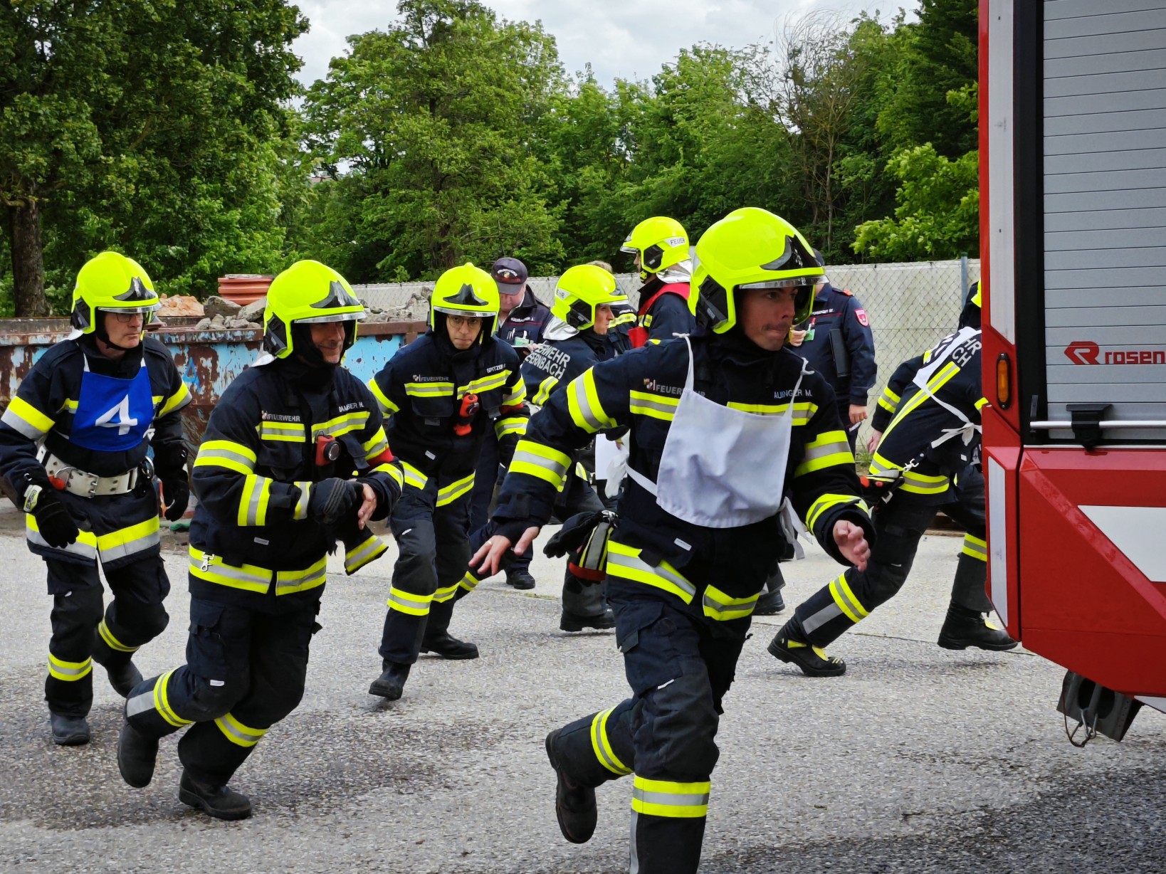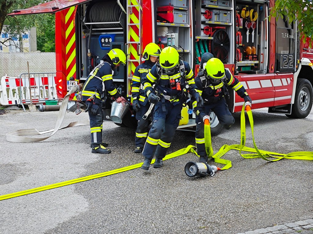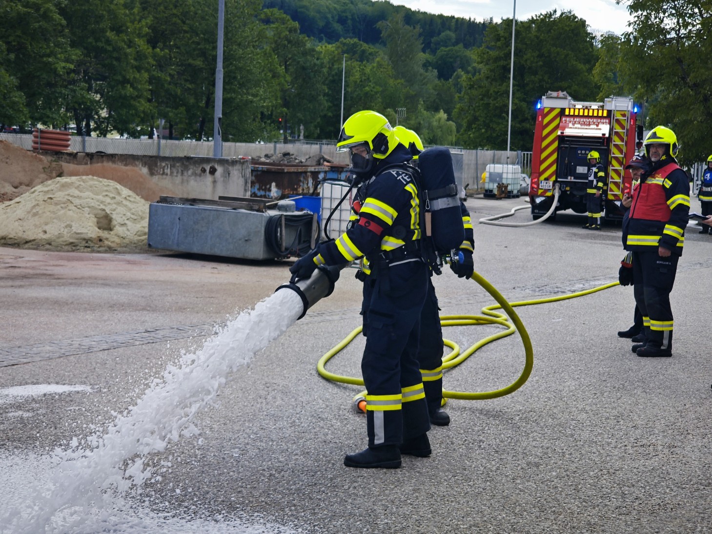 Nachdem die Gerätekunde positiv abgeschlossen wurde, erfolgte der Löschangriff in einer Sollzeit von 03:40 – 04:30 Minuten. Zwei Gruppen mussten einen Flüssigkeitsbrand mittels Mittelschaum unter Atemschutz und eine Gruppe einen Zimmerbrand bewältigen.