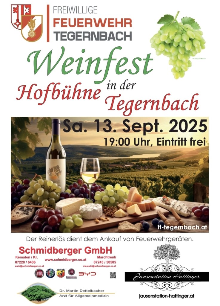 Die Freiwillige Feuerwehr Tegernbach lädt am Samstag, 13. September 2025 ab 19:00 Uhr zum traditionellen Weinfest in die Hofbühne Tegernbach ein.