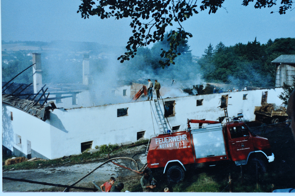 Durch Brandlegung bricht im Anwesen der Fam. Humer, Pollhamerwald 8 ein Großbrand aus der den gesamten Wirtschaftstrakt vernichtet.