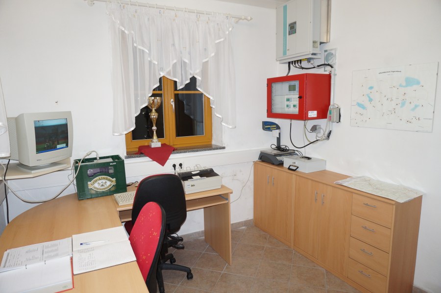 Kommandoraum; Schreibtisch mit PC, Warn- und Alarmsystem, Wechselrichter der Photovoltaikanlage